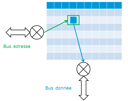 Le schema ci-dessus représente la mémoire et permet de mieux comprendre le principe de bus d’unité et de données. Ici le processeur vient de calculer une valeur et veut la conserver. Il l’envoie par les bus des données en même temps qu’une adresse unique par le bus d’adresses. La mémoire « range » l’information dans la case qui correspond à la valeur d’adresse. Lorsque le processeur souhaite réutiliser cette valeur, il lui suffit de renvoyer l’adresse qui correspond à celle-ci ; la mémoire lui renvoie alors la donnée qui correspond.
