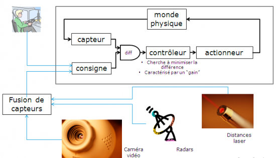 Ce schéma nous permet de montrer que le conducteurs qui dans une voiture, qui s’occupe de la diriger et qui constitue la consigne dans la loi de contrôle, peut être remplacé par une fusion de capteurs dans la théorie de la voiture autonome.