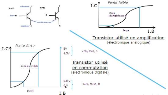 Ainsi la tension à la base définit l’état du transistor et permet d’établir la notion de bit, où le transistor peut être en position 0 ou 1.
