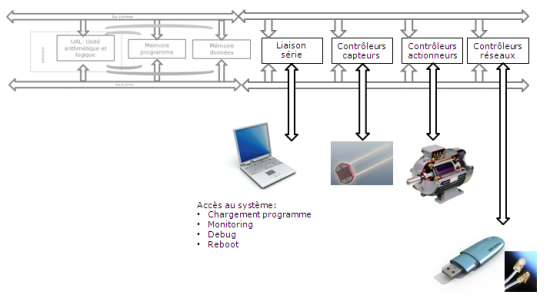 Un robot fonctionne sur le même principe, sauf que les « extensions » et les programmes dans la mémoire programme ne sont pas les mêmes. On garde notre carte mère, à laquelle on ajoute une liaison série pour permettre à un ordinateur de se connecter à l’ensemble (pour charger un programme, redémarrer l’ensemble, afficher des informations sur les calculs du robot, chercher des bugs dans le robot), des capteurs pour permettre au robot de « sentir » son environnement, des actionneurs (moteurs par exemple) pour que le robot puisse interagir avec son environnement et enfin des contrôleurs réseaux pour qu’il puisse envoyer et recevoir des données à distance. L’intelligence artificielledu robot, quant-à-elle est programmée dans la mémoire programme.