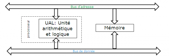 L’unité de calcul et la mémoire sont reliés par deux ‘bus’ : le bus d’adresse et le bus de données. Des mots de 16, 32 ou 64 bits sont échangés. Le bus est constitué d’autant de fils électriques que la capacité de longueur des mots en bits (16 fils pour des mots de 16 bits). Ces mots sont utilisés à la fois comme donnée et comme adresse à laquelle chercher une donnée dans une mémoire. Comme leur nom l’indique, les mots relatifs aux données circulent par le bus de données et ceux relatifs aux adresses par le bus des adresses. Ainsi, un mot donné qui doit être « rangé » dans la mémoire, circule en même temps qu’un mot adresse associé qui lui permet d’être rangé ou de savoir d’où il vient.