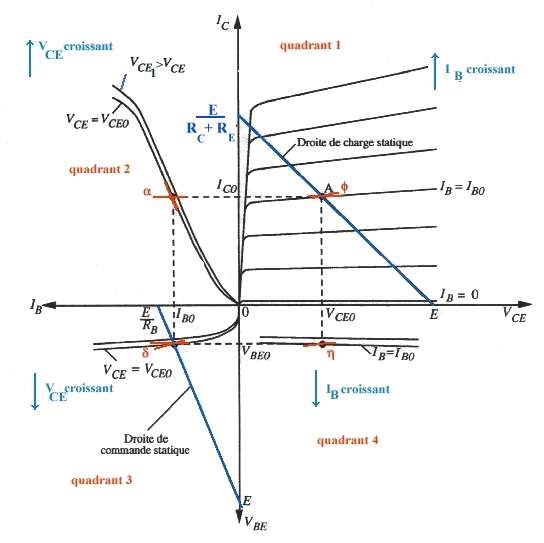 Trois fils sortent d’un transistor : B (base), C (collecteur) et E (émetteur). L’émetteur est souvent relié à la masse. La liaison entre l’émetteur et le collecteur peut être dans 3 états :